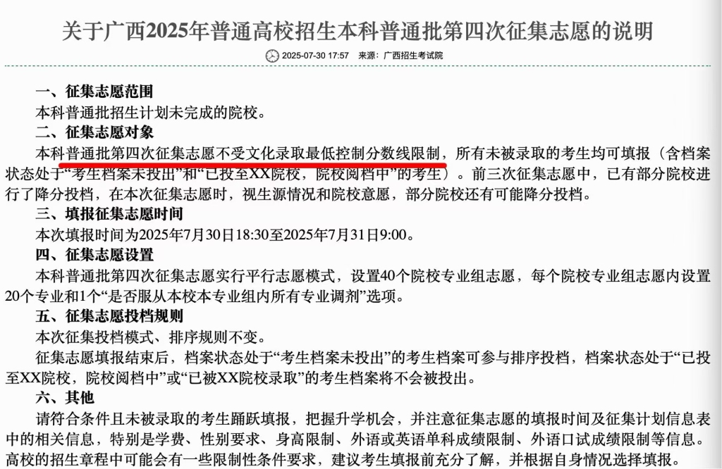 7月30日,广西教育考试院发布消息称,将开始2025年普通高校招生本科第四次征集志愿,且不受文化录取最低控制线限制。同日,黑龙江也发布了2025年普通高校招生普通本科第四次征集志愿通知。