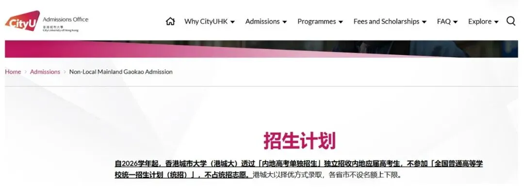 自2026学年起,香港城市大学(港城大)透过“内地高考单独招生”独立招收内地应届高考生,不参加“全国普通高等学校统一招生计划(统招)”,不占统招志愿。港城大以择优方式录取,各省市不设名额上下限。